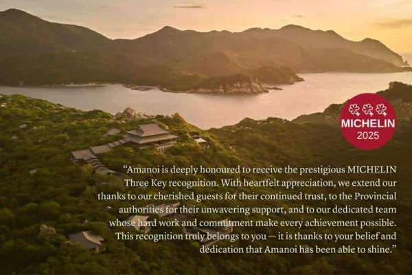 Trong danh sách được vinh danh năm nay, Amanoi – khu nghỉ dưỡng thuộc tập đoàn Aman, tọa lạc giữa lòng Vườn quốc gia Núi Chúa và hướng tầm nhìn ra vịnh Vĩnh Hy – đã được trao tặng Ba Michelin Key, hạng cao nhất trong hệ thống. Giải thưởng tôn vinh những khách sạn và khu nghỉ dưỡng hội tụ đầy đủ yếu tố kiến trúc, thiết kế, dịch vụ, và tinh thần hiếu khách hòa quyện hoàn hảo trong một tổng thể hài hòa.