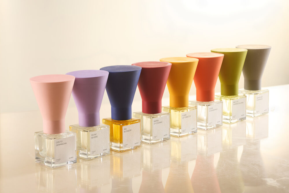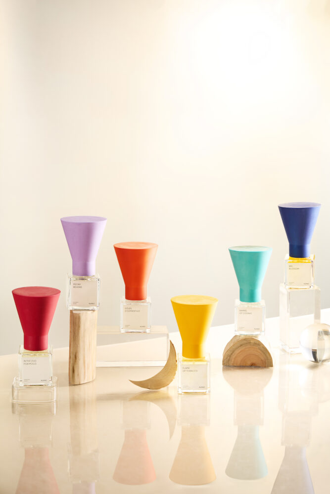 Bộ nắp nhiều màu sắc – từ xám tro, đỏ burgundy, vàng nghệ đến xanh olive – tượng trưng cho quang phổ rộng cảm xúc và cá tính khác nhau trong thế giới hương ALENEZ.