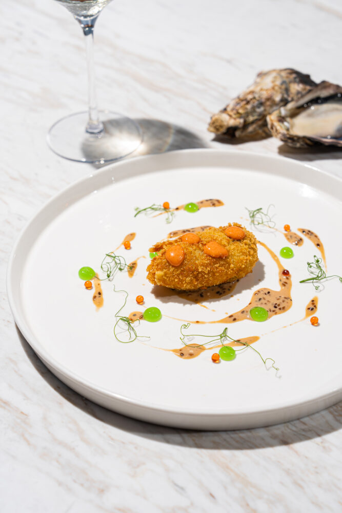 - Crispy Oyster with Apple Gelée, Pickled Vegetables & Sesame Soy Sauce — Hàu chiên giòn kèm thạch táo, dưa chua và xốt mè tương.
